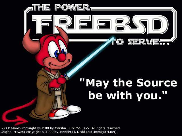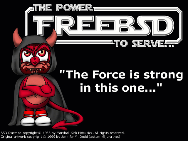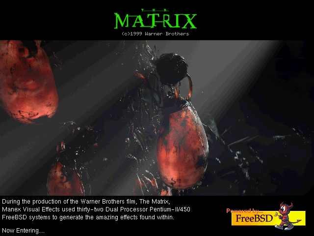 Charles Henrich Comments: A frame from the sci-fi movie Matrix along with some text and a power logo. The special effects for the movie were generated on machines powered by FreeBSD. File: bsd_matrix.bmp (640x480) |